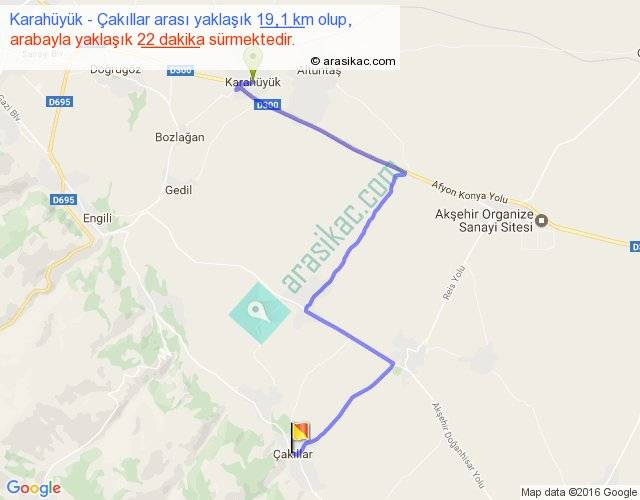 Karahüyük - Çakıllar arası yaklaşık olarak 90 km/h ile yukarıda belirtilen sürede olup, iki yerin kuş uçuşu uzaklığı (mesafesi) 11'dir. Yolculuk otobüsle 28 dakika sürmektedir.
