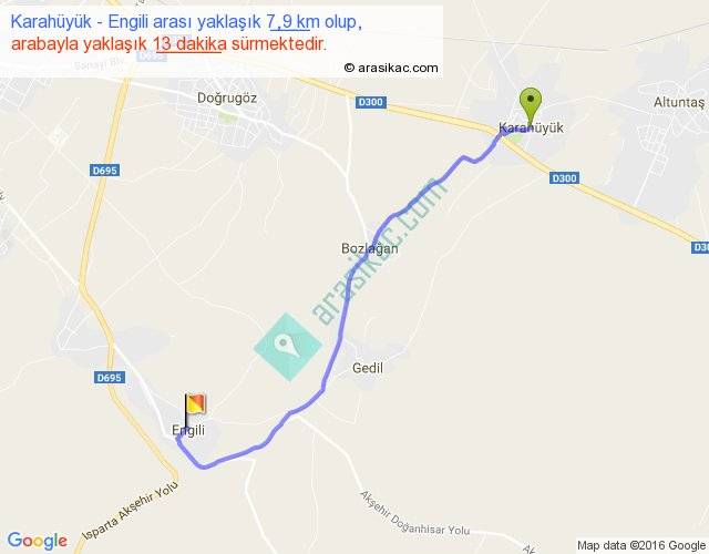 Karahüyük - Engili arası yaklaşık olarak 90 km/h ile yukarıda belirtilen sürede olup, iki yerin kuş uçuşu uzaklığı (mesafesi) 6'dir. Yolculuk otobüsle 16 dakika sürmektedir.