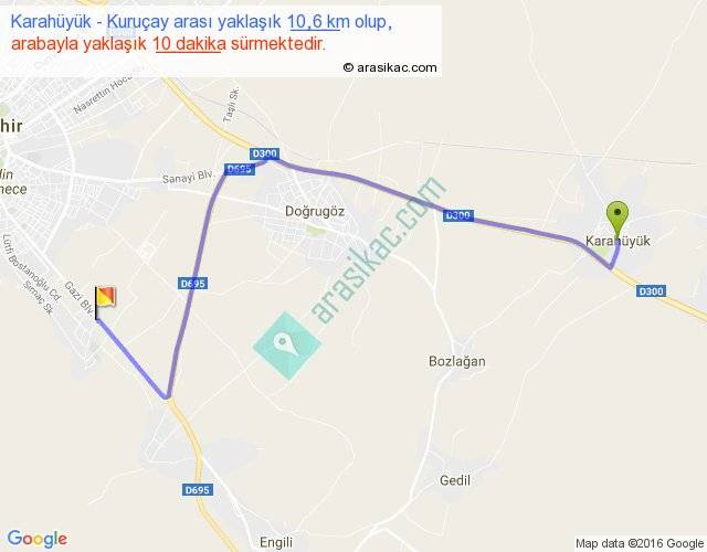 Karahüyük - Kuruçay arası yaklaşık olarak 90 km/h ile yukarıda belirtilen sürede olup, iki yerin kuş uçuşu uzaklığı (mesafesi) 7'dir. Yolculuk otobüsle 13 dakika sürmektedir.