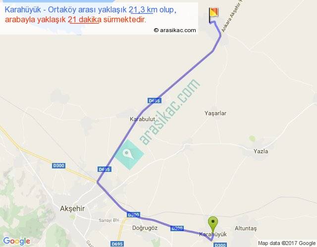 Karahüyük - Ortaköy arası yaklaşık olarak 90 km/h ile yukarıda belirtilen sürede olup, iki yerin kuş uçuşu uzaklığı (mesafesi) 13'dir. Yolculuk otobüsle 27 dakika sürmektedir.