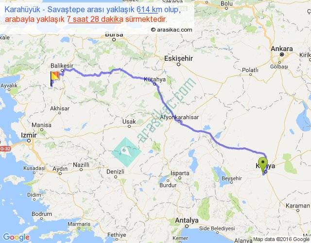 Karahüyük - Savaştepe arası yaklaşık olarak 90 km/h ile yukarıda belirtilen sürede olup, iki yerin kuş uçuşu uzaklığı (mesafesi) 447'dir. Eğer belirtilen yerler arasında uçak seferi var ise bu süre uçakla 41 dakika'ya kadar düşebilir. Yolculuk otobüsle 9 saat 42 dakika sürmektedir.