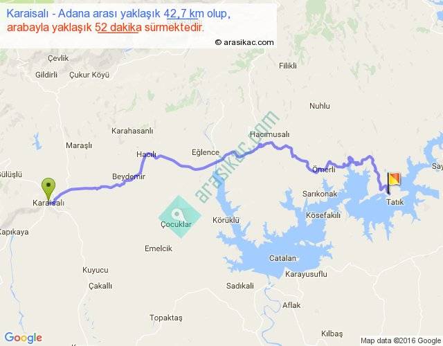 Karaisalı - Adana arası yaklaşık olarak 90 km/h ile yukarıda belirtilen sürede olup, iki yerin kuş uçuşu uzaklığı (mesafesi) 30'dir. Yolculuk otobüsle 1 saat 7 dakika sürmektedir.