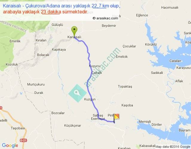 Karaisalı - Çukurova Adana arası yaklaşık olarak 90 km/h ile yukarıda belirtilen sürede olup, iki yerin kuş uçuşu uzaklığı (mesafesi) 19'dir. Yolculuk otobüsle 29 dakika sürmektedir.