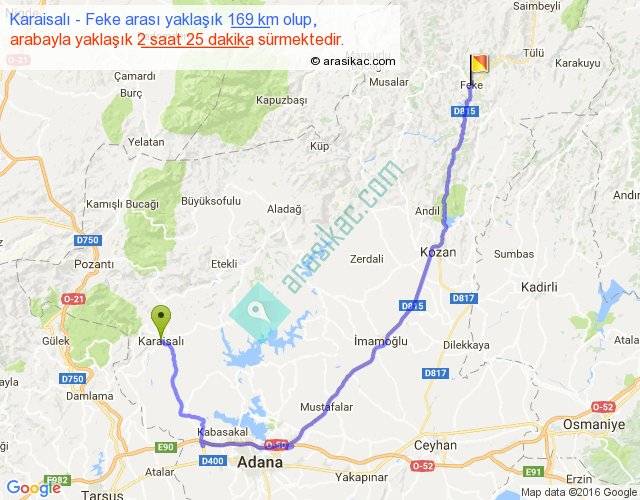 Karaisalı - Feke arası yaklaşık olarak 90 km/h ile yukarıda belirtilen sürede olup, iki yerin kuş uçuşu uzaklığı (mesafesi) 97'dir. Yolculuk otobüsle 3 saat 8 dakika sürmektedir.