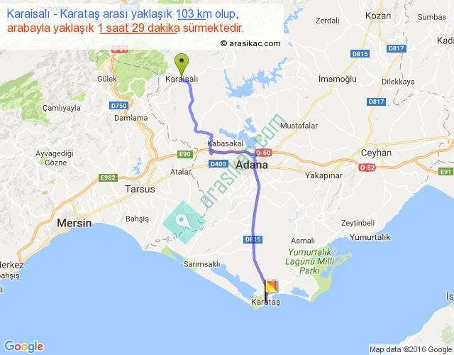 Karaisalı - Karataş arası yaklaşık olarak 90 km/h ile yukarıda belirtilen sürede olup, iki yerin kuş uçuşu uzaklığı (mesafesi) 82'dir. Yolculuk otobüsle 1 saat 55 dakika sürmektedir.