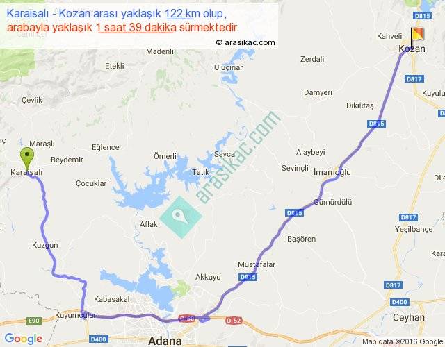 Karaisalı - Kozan arası yaklaşık olarak 90 km/h ile yukarıda belirtilen sürede olup, iki yerin kuş uçuşu uzaklığı (mesafesi) 70'dir. Yolculuk otobüsle 2 saat 12 dakika sürmektedir.