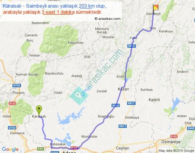 Karaisalı - Saimbeyli arası yaklaşık olarak 90 km/h ile yukarıda belirtilen sürede olup, iki yerin kuş uçuşu uzaklığı (mesafesi) 121'dir. Yolculuk otobüsle 3 saat 55 dakika sürmektedir.