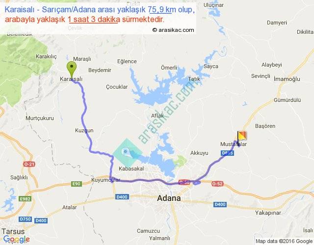 Karaisalı - Sarıçam Adana arası yaklaşık olarak 90 km/h ile yukarıda belirtilen sürede olup, iki yerin kuş uçuşu uzaklığı (mesafesi) 44'dir. Yolculuk otobüsle 1 saat 23 dakika sürmektedir.