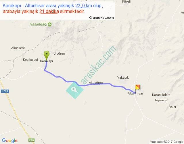 Karakapı - Altunhisar arası yaklaşık olarak 90 km/h ile yukarıda belirtilen sürede olup, iki yerin kuş uçuşu uzaklığı (mesafesi) 20'dir. Yolculuk otobüsle 27 dakika sürmektedir.