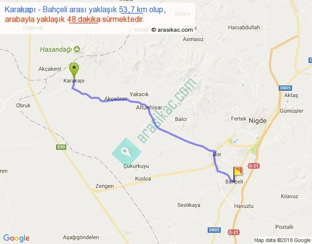 Karakapı - Bahçeli arası yaklaşık olarak 90 km/h ile yukarıda belirtilen sürede olup, iki yerin kuş uçuşu uzaklığı (mesafesi) 47'dir. Yolculuk otobüsle 1 saat 2 dakika sürmektedir.
