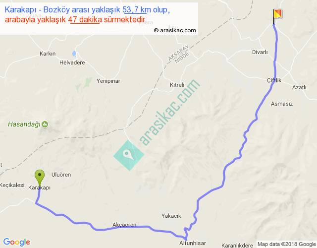 Karakapı - Bozköy arası yaklaşık olarak 90 km/h ile yukarıda belirtilen sürede olup, iki yerin kuş uçuşu uzaklığı (mesafesi) 34'dir. Yolculuk otobüsle 1 saat 1 dakika sürmektedir.