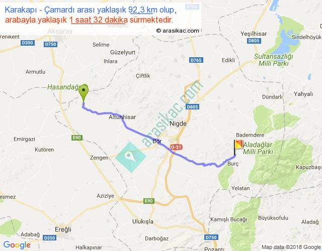 Karakapı - Çamardı arası yaklaşık olarak 90 km/h ile yukarıda belirtilen sürede olup, iki yerin kuş uçuşu uzaklığı (mesafesi) 76'dir. Yolculuk otobüsle 1 saat 59 dakika sürmektedir.