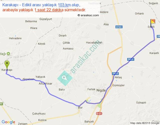 Karakapı - Edikli arası yaklaşık olarak 90 km/h ile yukarıda belirtilen sürede olup, iki yerin kuş uçuşu uzaklığı (mesafesi) 72'dir. Yolculuk otobüsle 1 saat 46 dakika sürmektedir.