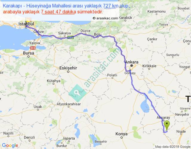 Karakapı - Hüseyinağa Mahallesi arası yaklaşık olarak 90 km/h ile yukarıda belirtilen sürede olup, iki yerin kuş uçuşu uzaklığı (mesafesi) 550'dir. Eğer belirtilen yerler arasında uçak seferi var ise bu süre uçakla 50 dakika'ya kadar düşebilir. Yolculuk otobüsle 10 saat 7 dakika sürmektedir.