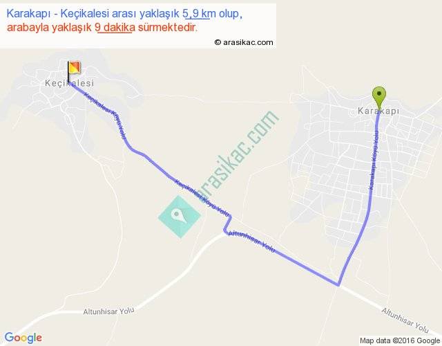 Karakapı - Keçikalesi arası yaklaşık olarak 90 km/h ile yukarıda belirtilen sürede olup, iki yerin kuş uçuşu uzaklığı (mesafesi) 3'dir. Yolculuk otobüsle 11 dakika sürmektedir.