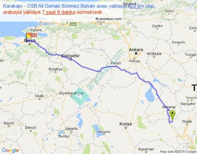 Karakapı - OSB Ali Osman Sönmez Bulvarı arası yaklaşık olarak 90 km/h ile yukarıda belirtilen sürede olup, iki yerin kuş uçuşu uzaklığı (mesafesi) 507'dir. Eğer belirtilen yerler arasında uçak seferi var ise bu süre uçakla 46 dakika'ya kadar düşebilir. Yolculuk otobüsle 9 saat 16 dakika sürmektedir.