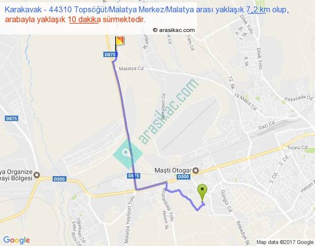 Karakavak - 44310 Topsöğüt Malatya Merkez Malatya arası yaklaşık olarak 90 km/h ile yukarıda belirtilen sürede olup, iki yerin kuş uçuşu uzaklığı (mesafesi) 5'dir. Yolculuk otobüsle 13 dakika sürmektedir.
