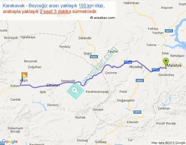 Karakavak - Beyceğiz arası yaklaşık olarak 90 km/h ile yukarıda belirtilen sürede olup, iki yerin kuş uçuşu uzaklığı (mesafesi) 118'dir. Yolculuk otobüsle 2 saat 39 dakika sürmektedir.