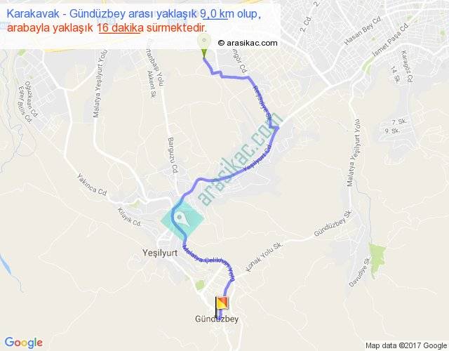 Karakavak - Gündüzbey arası yaklaşık olarak 90 km/h ile yukarıda belirtilen sürede olup, iki yerin kuş uçuşu uzaklığı (mesafesi) 6'dir. Yolculuk otobüsle 20 dakika sürmektedir.
