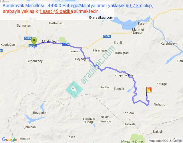 Karakavak Mahallesi - 44850 Pütürge Malatya arası yaklaşık olarak 90 km/h ile yukarıda belirtilen sürede olup, iki yerin kuş uçuşu uzaklığı (mesafesi) 51'dir. Yolculuk otobüsle 2 saat 21 dakika sürmektedir.