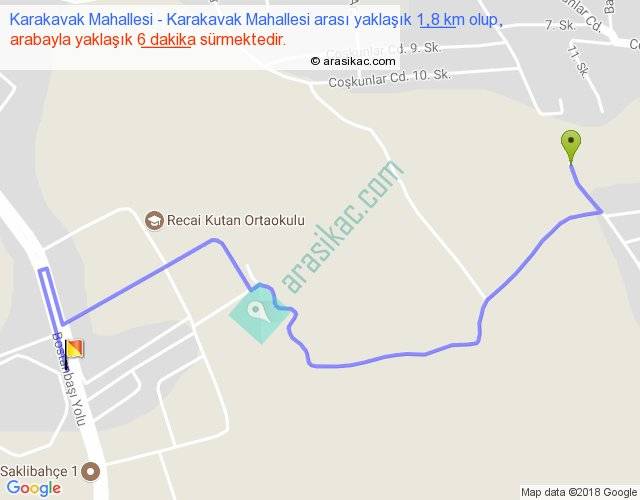 Karakavak Mahallesi - Karakavak Mahallesi arası yaklaşık olarak 90 km/h ile yukarıda belirtilen sürede olup, iki yerin kuş uçuşu uzaklığı (mesafesi) 1'dir. Yolculuk otobüsle 7 dakika sürmektedir.