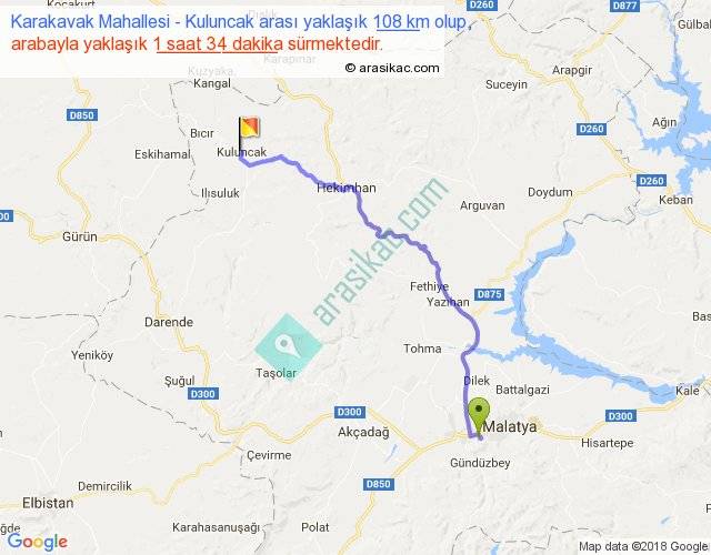 Karakavak Mahallesi - Kuluncak arası yaklaşık olarak 90 km/h ile yukarıda belirtilen sürede olup, iki yerin kuş uçuşu uzaklığı (mesafesi) 79'dir. Yolculuk otobüsle 2 saat 2 dakika sürmektedir.