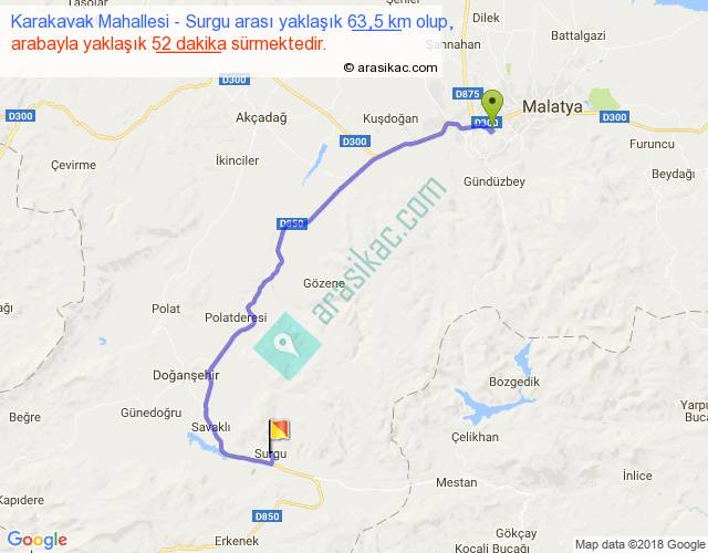Karakavak Mahallesi - Surgu arası yaklaşık olarak 90 km/h ile yukarıda belirtilen sürede olup, iki yerin kuş uçuşu uzaklığı (mesafesi) 42'dir. Yolculuk otobüsle 1 saat 7 dakika sürmektedir.