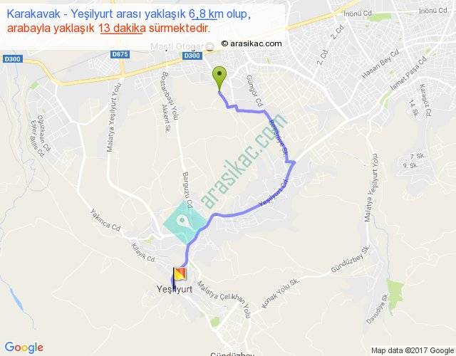 Karakavak - Yeşilyurt arası yaklaşık olarak 90 km/h ile yukarıda belirtilen sürede olup, iki yerin kuş uçuşu uzaklığı (mesafesi) 4'dir. Yolculuk otobüsle 16 dakika sürmektedir.