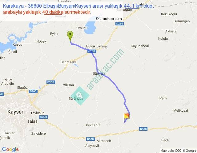 Karakaya - 38600 Elbaşı Bünyan Kayseri arası yaklaşık olarak 90 km/h ile yukarıda belirtilen sürede olup, iki yerin kuş uçuşu uzaklığı (mesafesi) 38'dir. Yolculuk otobüsle 52 dakika sürmektedir.