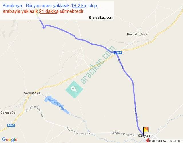 Karakaya - Bünyan arası yaklaşık olarak 90 km/h ile yukarıda belirtilen sürede olup, iki yerin kuş uçuşu uzaklığı (mesafesi) 16'dir. Yolculuk otobüsle 27 dakika sürmektedir.