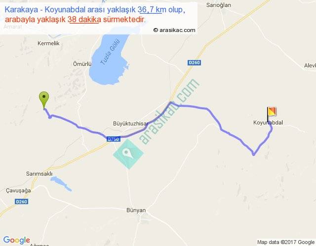 Karakaya - Koyunabdal arası yaklaşık olarak 90 km/h ile yukarıda belirtilen sürede olup, iki yerin kuş uçuşu uzaklığı (mesafesi) 27'dir. Yolculuk otobüsle 49 dakika sürmektedir.