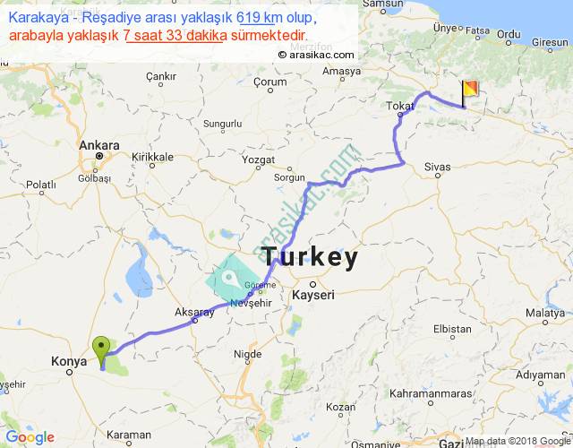 Karakaya - Reşadiye arası yaklaşık olarak 90 km/h ile yukarıda belirtilen sürede olup, iki yerin kuş uçuşu uzaklığı (mesafesi) 470'dir. Eğer belirtilen yerler arasında uçak seferi var ise bu süre uçakla 43 dakika'ya kadar düşebilir. Yolculuk otobüsle 9 saat 48 dakika sürmektedir.