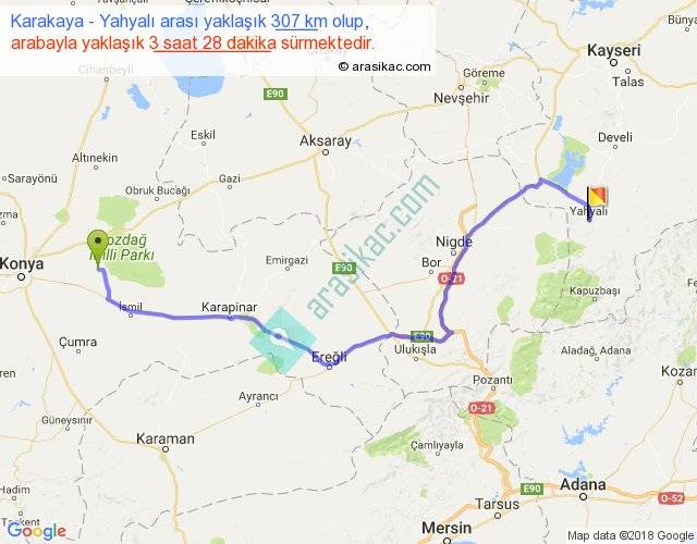 Karakaya - Yahyalı arası yaklaşık olarak 90 km/h ile yukarıda belirtilen sürede olup, iki yerin kuş uçuşu uzaklığı (mesafesi) 217'dir. Yolculuk otobüsle 4 saat 30 dakika sürmektedir.