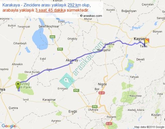Karakaya - Zincidere arası yaklaşık olarak 90 km/h ile yukarıda belirtilen sürede olup, iki yerin kuş uçuşu uzaklığı (mesafesi) 248'dir. Yolculuk otobüsle 4 saat 52 dakika sürmektedir.