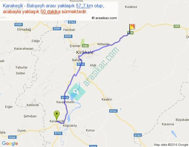 Karakeçili - Balışeyh arası yaklaşık olarak 90 km/h ile yukarıda belirtilen sürede olup, iki yerin kuş uçuşu uzaklığı (mesafesi) 45'dir. Yolculuk otobüsle 1 saat 5 dakika sürmektedir.