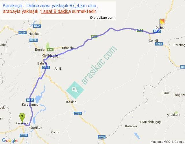 Karakeçili - Delice arası yaklaşık olarak 90 km/h ile yukarıda belirtilen sürede olup, iki yerin kuş uçuşu uzaklığı (mesafesi) 68'dir. Yolculuk otobüsle 1 saat 29 dakika sürmektedir.