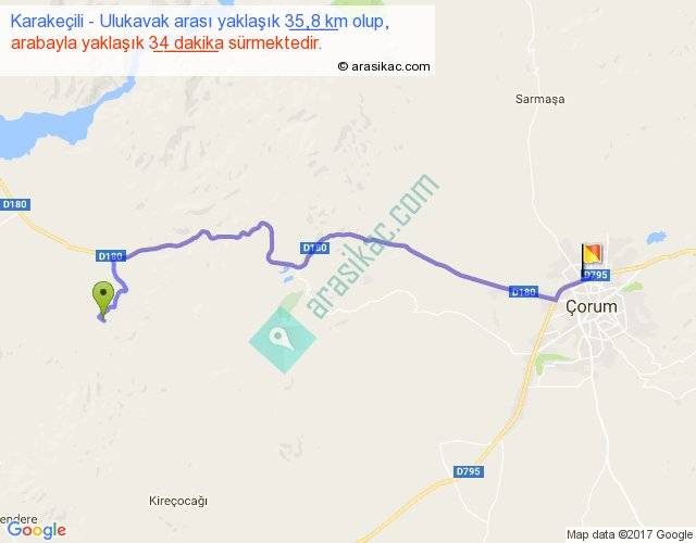 Karakeçili - Ulukavak arası yaklaşık olarak 90 km/h ile yukarıda belirtilen sürede olup, iki yerin kuş uçuşu uzaklığı (mesafesi) 26'dir. Yolculuk otobüsle 44 dakika sürmektedir.