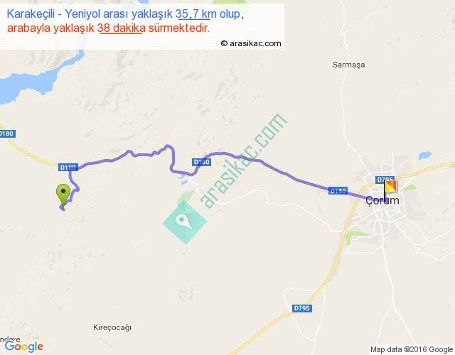 Karakeçili - Yeniyol arası yaklaşık olarak 90 km/h ile yukarıda belirtilen sürede olup, iki yerin kuş uçuşu uzaklığı (mesafesi) 26'dir. Yolculuk otobüsle 49 dakika sürmektedir.