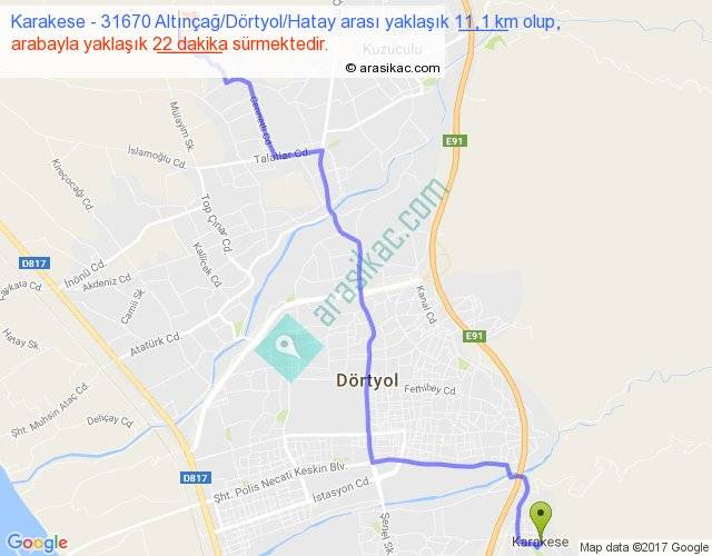 Karakese - 31670 Altınçağ Dörtyol Hatay arası yaklaşık olarak 90 km/h ile yukarıda belirtilen sürede olup, iki yerin kuş uçuşu uzaklığı (mesafesi) 8'dir. Yolculuk otobüsle 28 dakika sürmektedir.