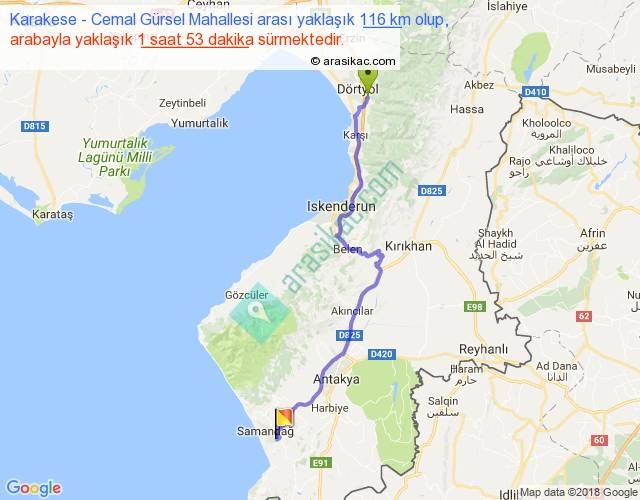 Karakese - Cemal Gürsel Mahallesi arası yaklaşık olarak 90 km/h ile yukarıda belirtilen sürede olup, iki yerin kuş uçuşu uzaklığı (mesafesi) 86'dir. Yolculuk otobüsle 2 saat 26 dakika sürmektedir.