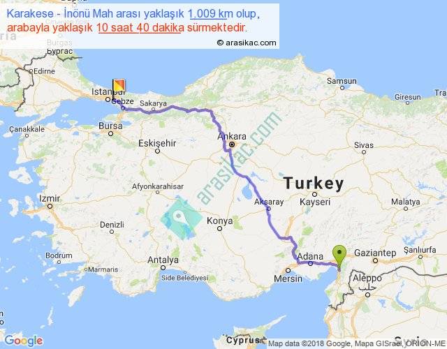 Karakese - İnönü Mah arası yaklaşık olarak 90 km/h ile yukarıda belirtilen sürede olup, iki yerin kuş uçuşu uzaklığı (mesafesi) 763'dir. Eğer belirtilen yerler arasında uçak seferi var ise bu süre uçakla 1 saat 10 dakika'ya kadar düşebilir. Yolculuk otobüsle 13 saat 52 dakika sürmektedir.