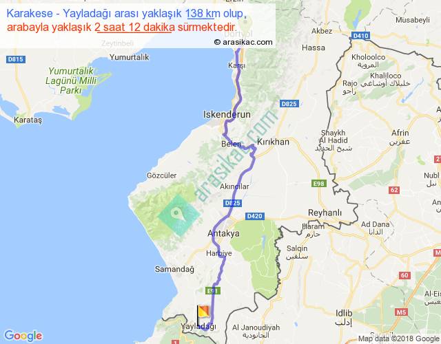 Karakese - Yayladağı arası yaklaşık olarak 90 km/h ile yukarıda belirtilen sürede olup, iki yerin kuş uçuşu uzaklığı (mesafesi) 103'dir. Yolculuk otobüsle 2 saat 51 dakika sürmektedir.
