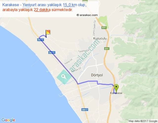 Karakese - Yeniyurt arası yaklaşık olarak 90 km/h ile yukarıda belirtilen sürede olup, iki yerin kuş uçuşu uzaklığı (mesafesi) 11'dir. Yolculuk otobüsle 28 dakika sürmektedir.