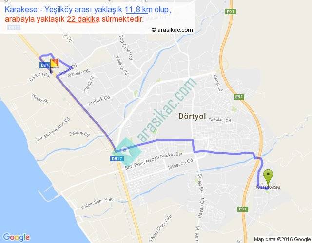 Karakese - Yeşilköy arası yaklaşık olarak 90 km/h ile yukarıda belirtilen sürede olup, iki yerin kuş uçuşu uzaklığı (mesafesi) 8'dir. Yolculuk otobüsle 28 dakika sürmektedir.