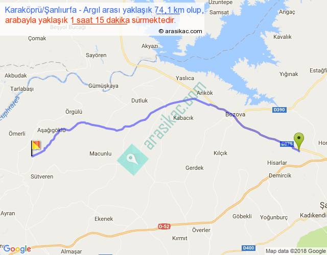 Karaköprü Şanlıurfa - Argıl arası yaklaşık olarak 90 km/h ile yukarıda belirtilen sürede olup, iki yerin kuş uçuşu uzaklığı (mesafesi) 63'dir. Yolculuk otobüsle 1 saat 37 dakika sürmektedir.