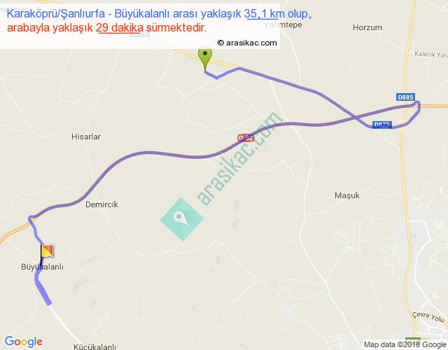 Karaköprü Şanlıurfa - Büyükalanlı arası yaklaşık olarak 90 km/h ile yukarıda belirtilen sürede olup, iki yerin kuş uçuşu uzaklığı (mesafesi) 11'dir. Yolculuk otobüsle 37 dakika sürmektedir.
