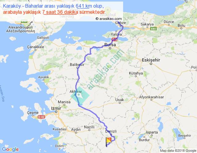 Karaköy - Baharlar arası yaklaşık olarak 90 km/h ile yukarıda belirtilen sürede olup, iki yerin kuş uçuşu uzaklığı (mesafesi) 396'dir. Eğer belirtilen yerler arasında uçak seferi var ise bu süre uçakla 36 dakika'ya kadar düşebilir. Yolculuk otobüsle 9 saat 52 dakika sürmektedir.