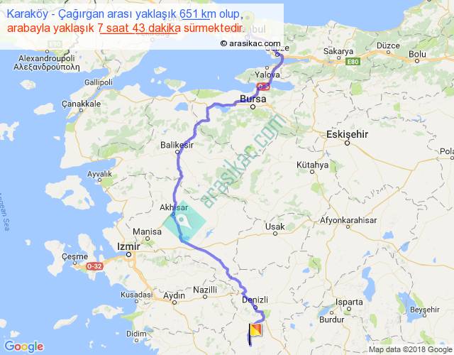 Karaköy - Çağırgan arası yaklaşık olarak 90 km/h ile yukarıda belirtilen sürede olup, iki yerin kuş uçuşu uzaklığı (mesafesi) 410'dir. Eğer belirtilen yerler arasında uçak seferi var ise bu süre uçakla 37 dakika'ya kadar düşebilir. Yolculuk otobüsle 10 saat 1 dakika sürmektedir.