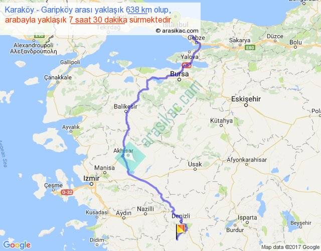 Karaköy - Garipköy arası yaklaşık olarak 90 km/h ile yukarıda belirtilen sürede olup, iki yerin kuş uçuşu uzaklığı (mesafesi) 393'dir. Eğer belirtilen yerler arasında uçak seferi var ise bu süre uçakla 36 dakika'ya kadar düşebilir. Yolculuk otobüsle 9 saat 45 dakika sürmektedir.