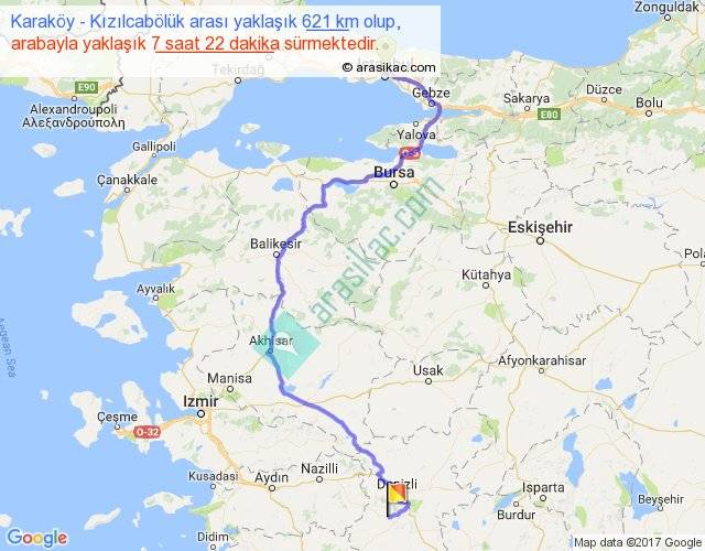 Karaköy - Kızılcabölük arası yaklaşık olarak 90 km/h ile yukarıda belirtilen sürede olup, iki yerin kuş uçuşu uzaklığı (mesafesi) 377'dir. Eğer belirtilen yerler arasında uçak seferi var ise bu süre uçakla 34 dakika'ya kadar düşebilir. Yolculuk otobüsle 9 saat 34 dakika sürmektedir.